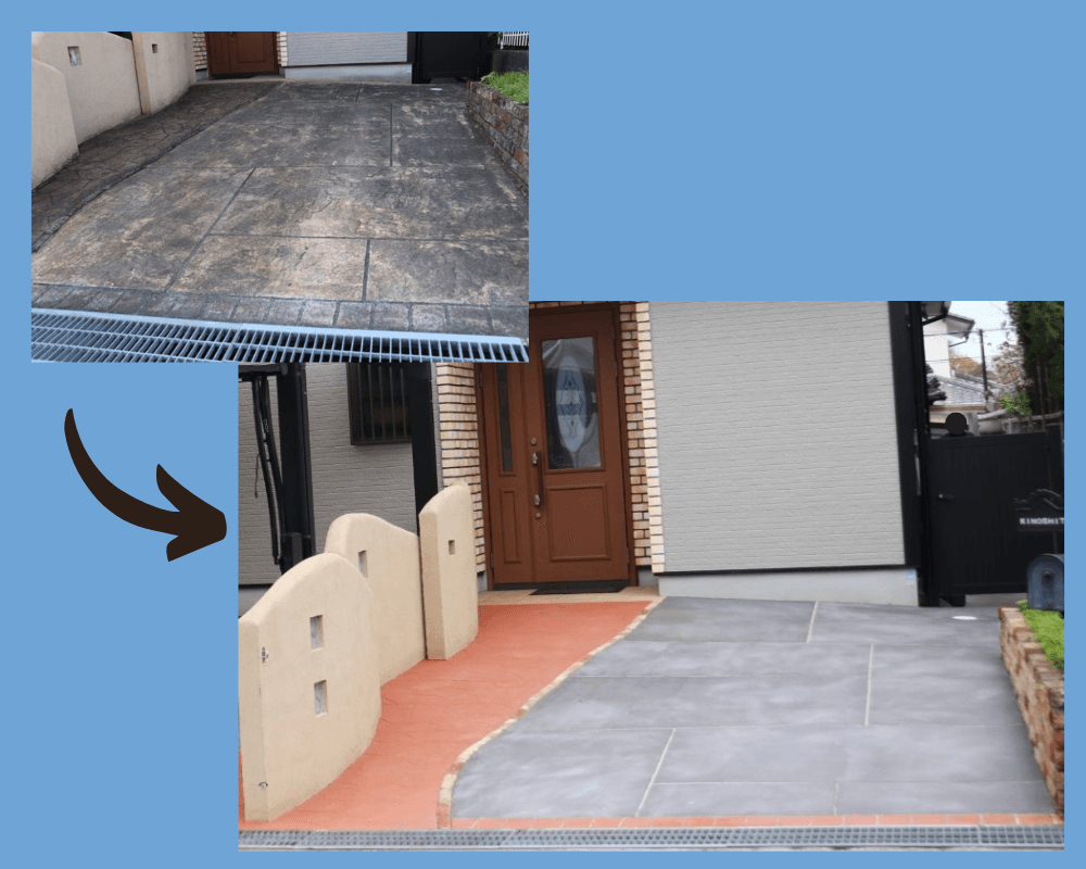 建物外壁、ブロック塀、擁壁、アプローチ階段、アプローチタイル、コンクリート床、門柱、